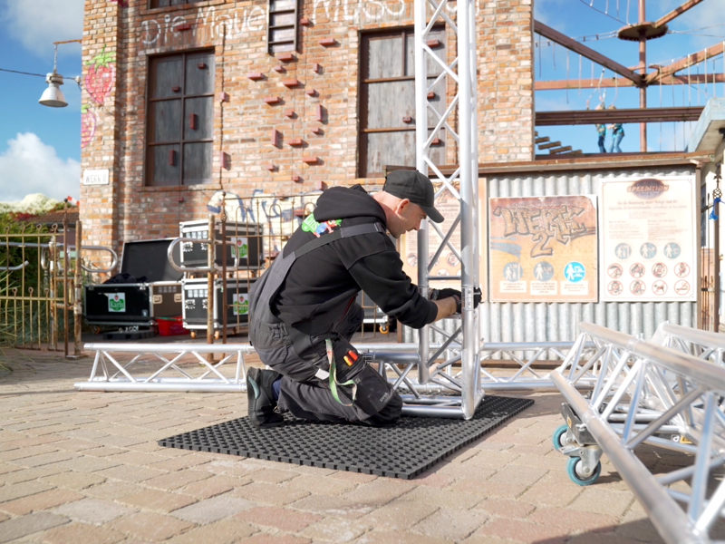 Parallel entstand das Gerüst für die Kinderdisko und die spätere Lichtershow. Meterlange Traversen wurden zusammengesetzt, verschraubt und sicher verankert. Der Aufbau wirkt leicht, ist aber echte Millimeterarbeit – erst wenn alles perfekt ausgerichtet ist, darf die Technik hochgefahren werden.
